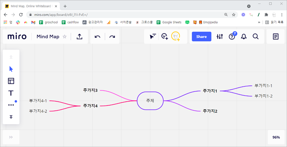 - 주제 -> 주가지 -> 부가지 순으로 연결해 발산
