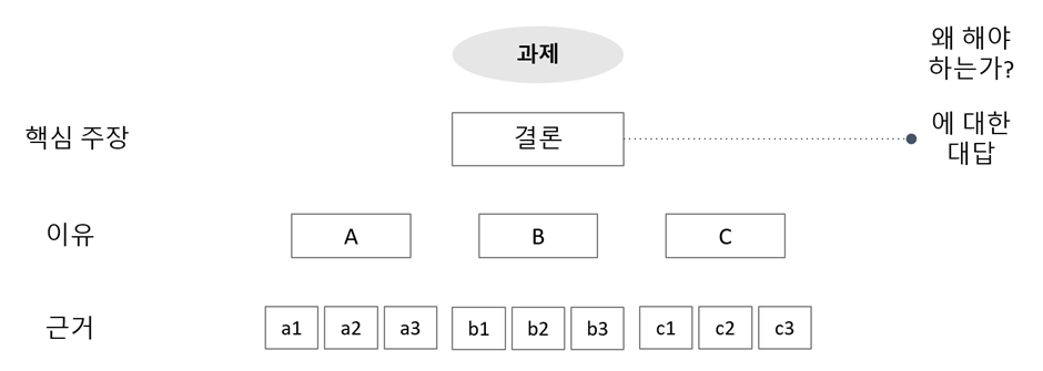 : 듣는 사람의 입장에서 가장 궁금해하는 사항인 결론부터 제시하고 이유와 근거를 논리적 관계를 고려해 전달하는 방식