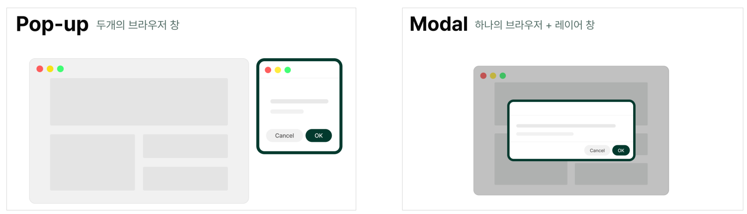 - 모달(Modal): 기존의 브라우저 페이지 위에 새로운 창이 아닌, 레이어를 까는 것