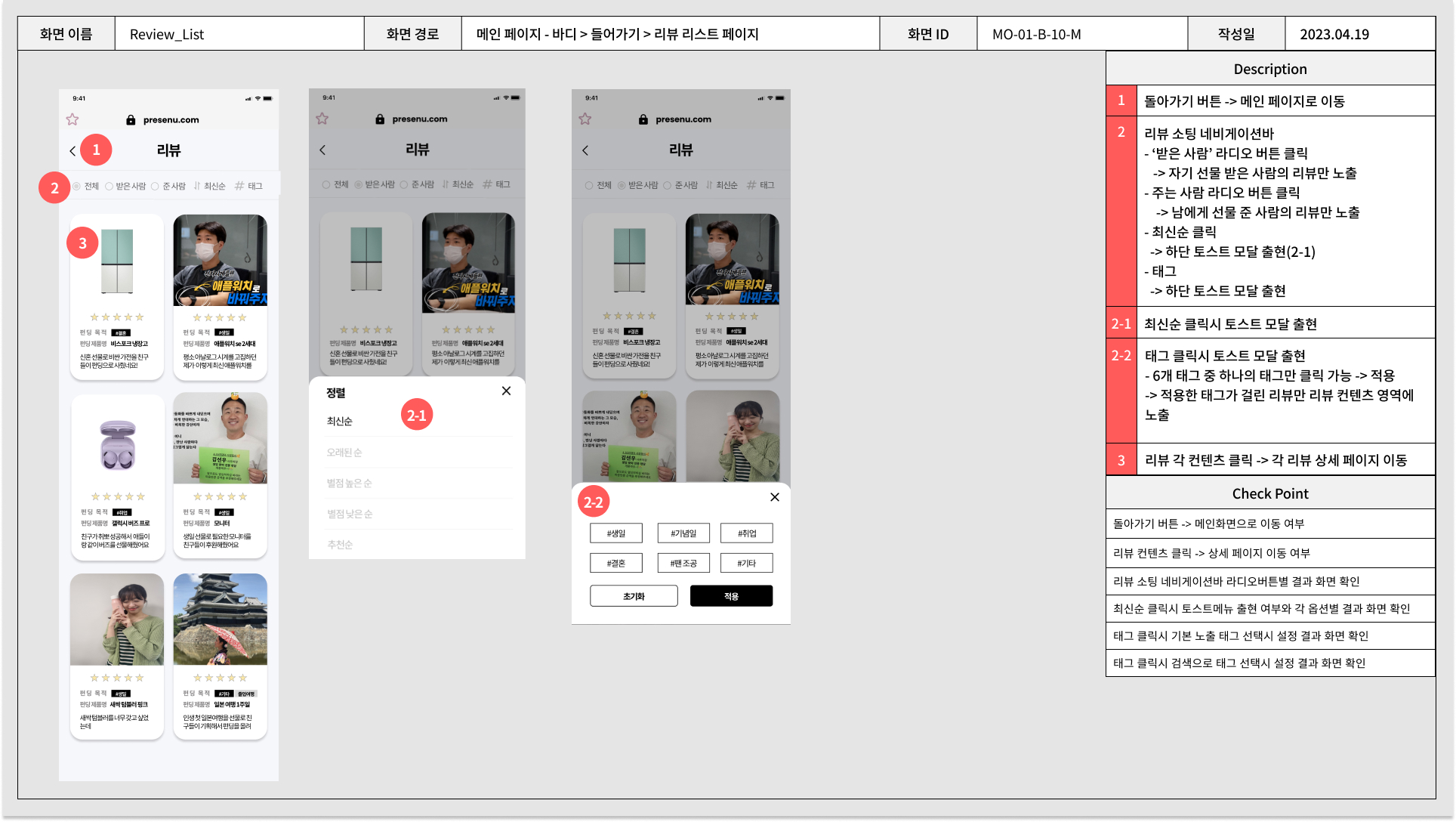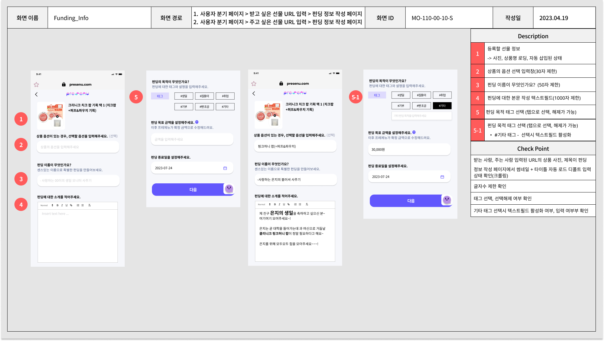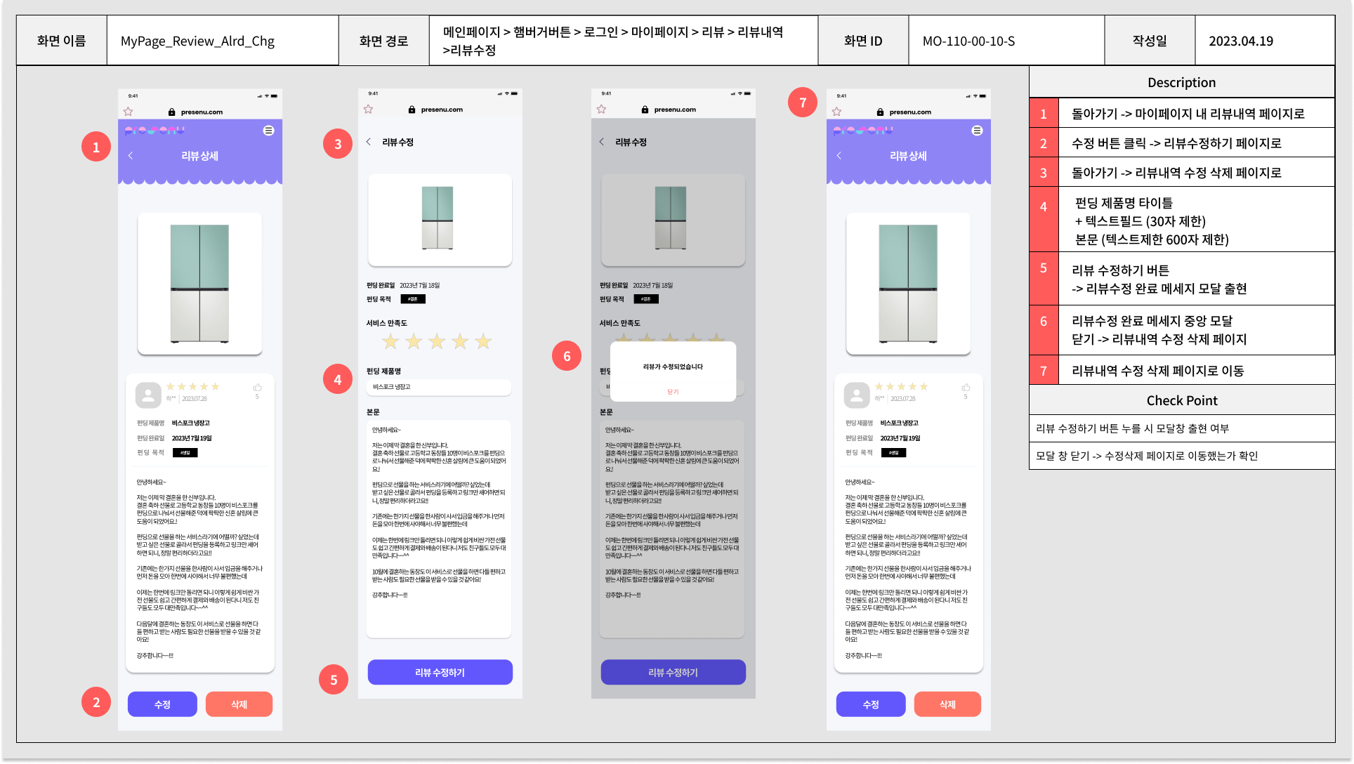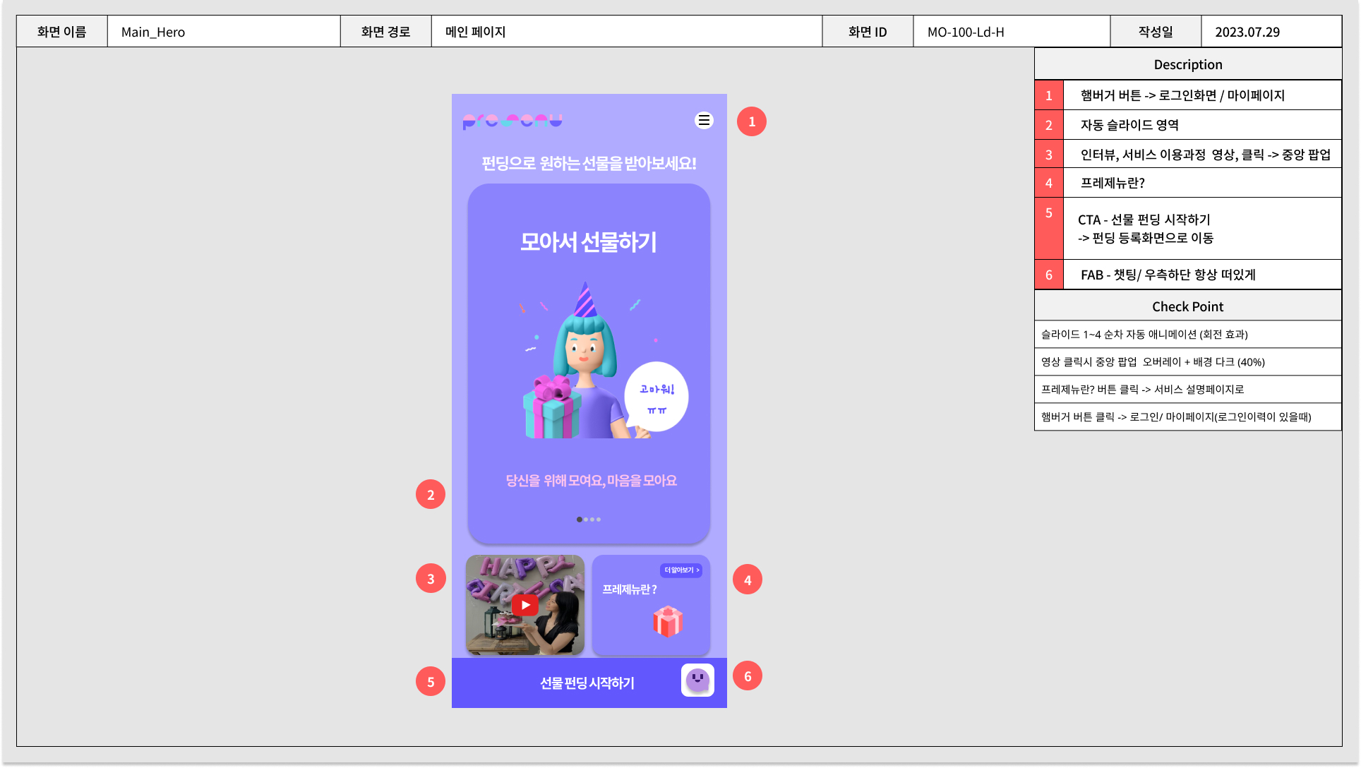 6) 디스크립션 (기능명세서): 와이어프레임에 숫자를 표시하여 해당 숫자에 해당하는 설명이나 로직, 디자인 솔루션 사용 등 설명할 수 있는 모든 것을 기입
