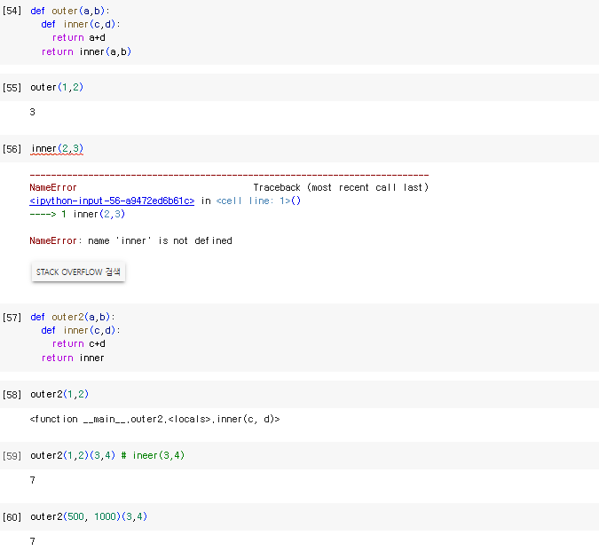 - 함수가 지역영역에 선언, 함수 안에 함수가 선언