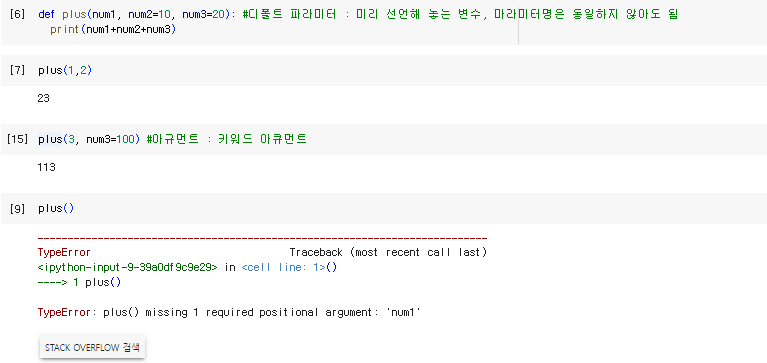 - keyword args의 경우 아규먼트로 함수 호출 시 키워드를 작성하여 호출
