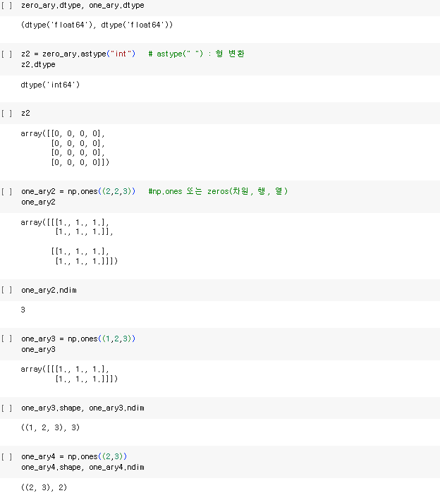 - array.dtype : array 안의 데이터 타입을 확인할 때 사용하는 명령
