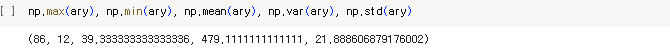 - max, min, mean(평균값), median(중앙값), var(분산), std(표준편차)