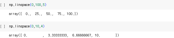 - linspace(시작, 끝, 나눌 구간) : 설정한 범위에서 선형적으로 분할한 위치의 값을 출력