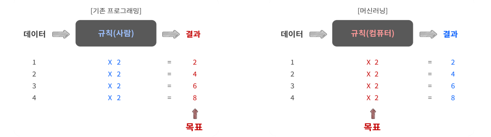 - 머신러닝: 데이터 + 출력 → 규칙 생성