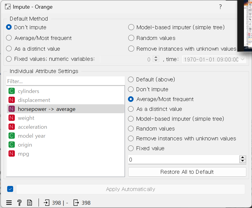 - Imput > 'horsepower -> Average'