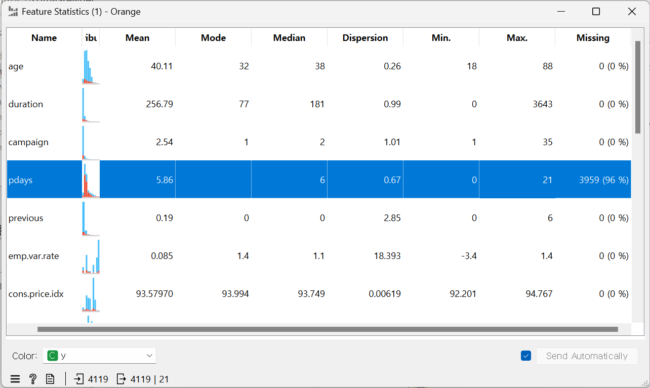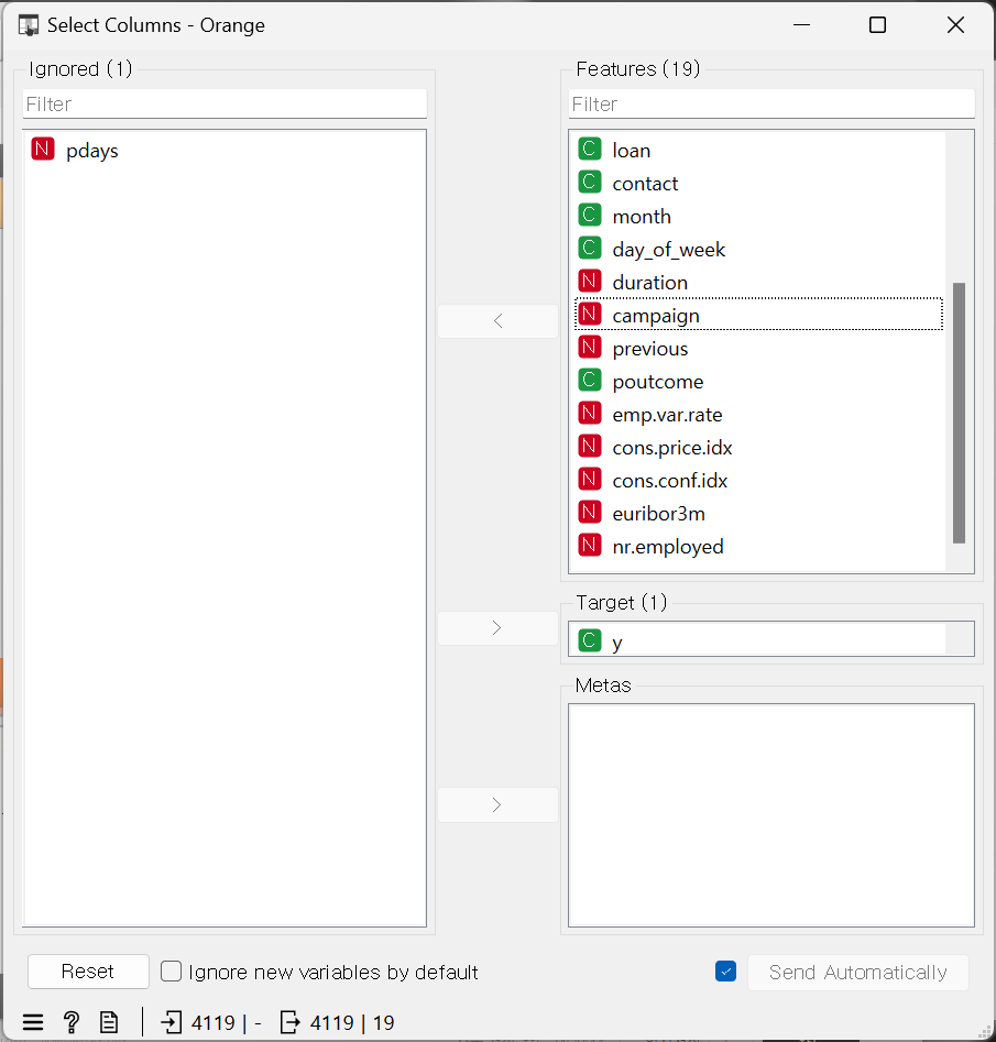 pdays의 누락값 96%라서 아예 삭제해 주기: Select Columns > pdays를 Ignored에 옮기기