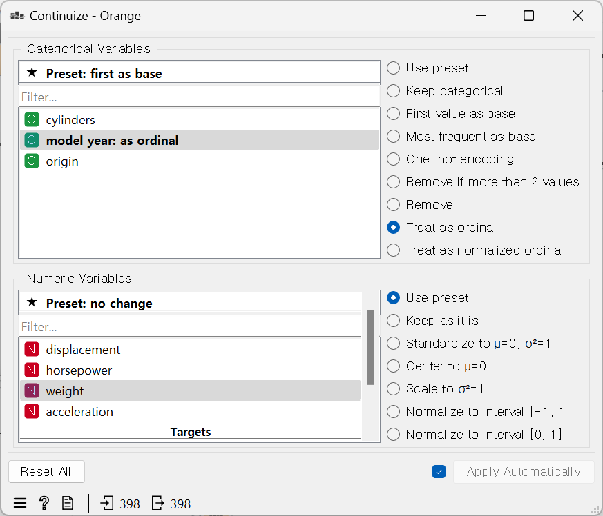 model year 항목을 변환 → Continuize > model year > Treat as ordinal