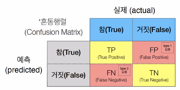 - 혼동 행렬: 알고리즘이 잘 예측했는지, 안 했는지 확인