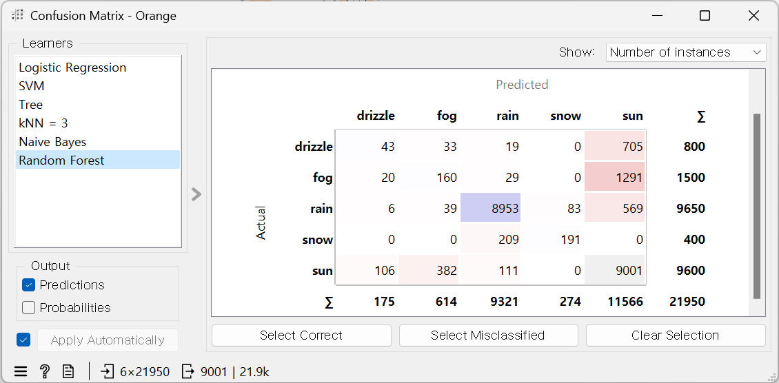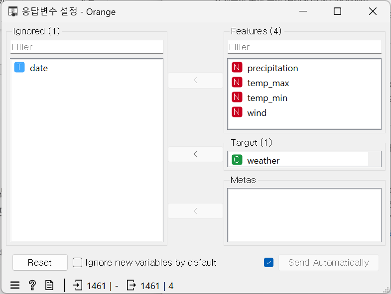타깃 변수는 weather로 설정하고, 날짜는 필요 없기 때문에 숨겨주자.