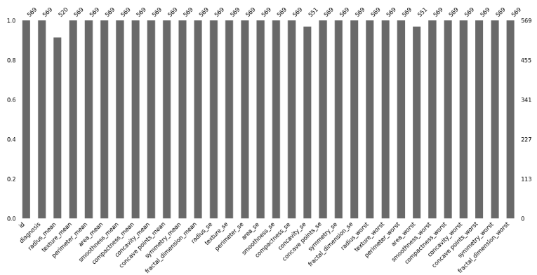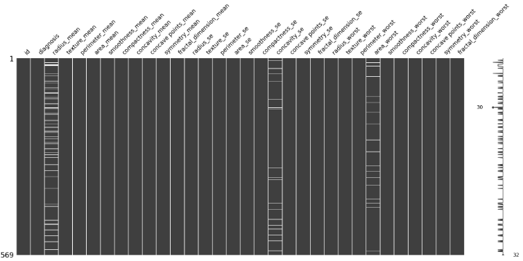 wbsc.isnull().sum()이 데이터에서는 radius_mean(49개), concavity_se(18개), area_worst(18개)에 결측치가 있다고 나온다.
