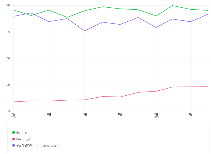 - ‘GA’와 ‘구글애널리틱스’에 비해 검색수 자체는 훨씬 낫지만 꾸준히 증가하는 것은 ‘GA4’이다.