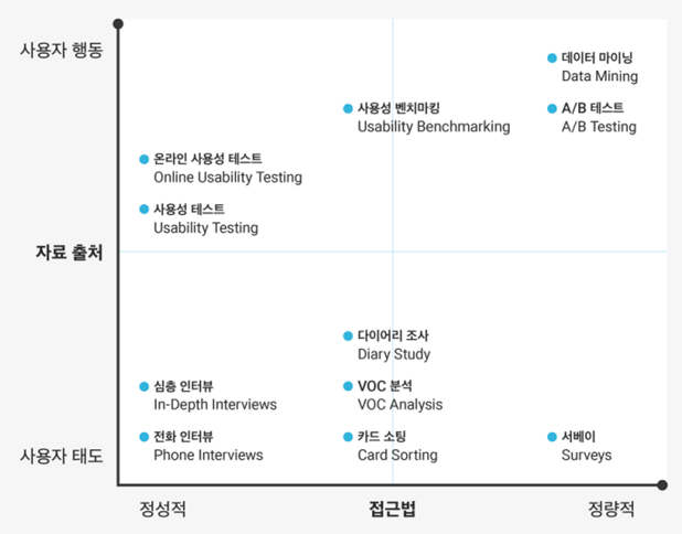 - 정량조사: 설문조사, 만족도 조사, AB 테스트, 뷰저블 또는 Hotjar 등 실제 사용자 행동, GA