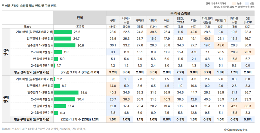 - 일주일 기준 2023년 평균 접속 빈도는 3회, 구매 빈도는 1.2회