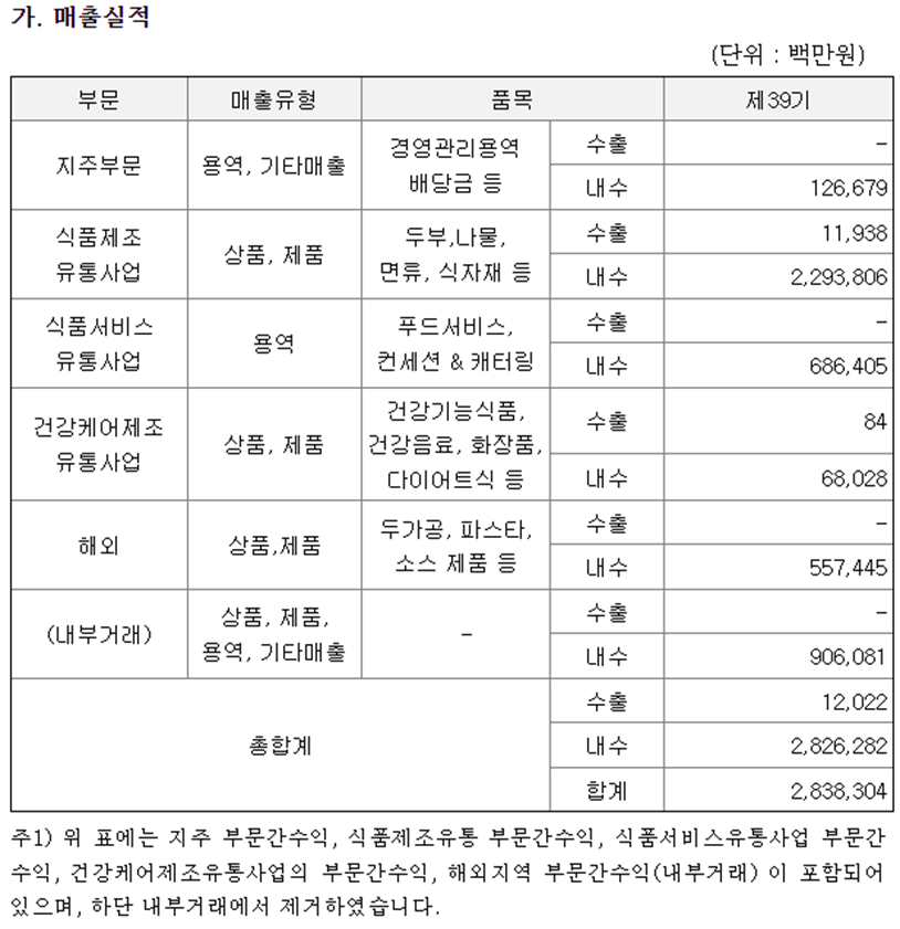 출처: DART > ‘풀무원’ 사업보고서(2023.03) > II. 사업의 내용 > 4. 매출 및 수주상황