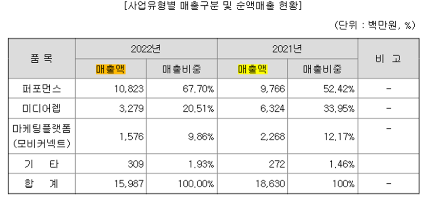3. 모비데이즈 퍼포먼스 부문/ 미디어렙 부문의 22년도 매출액과 총 매출액에서의 비율은 어떻게 될까?