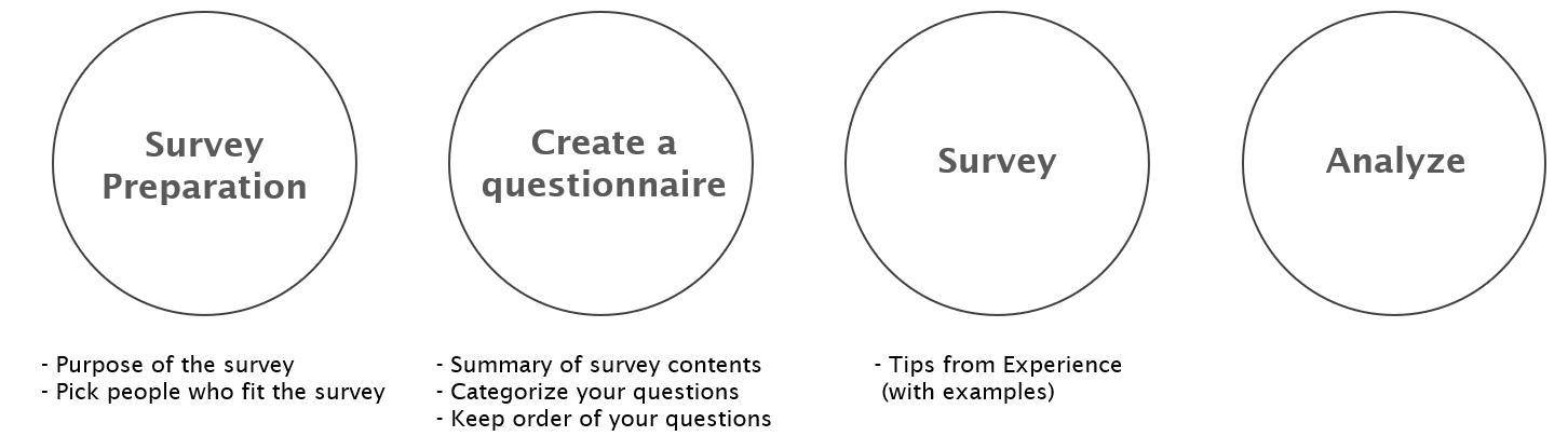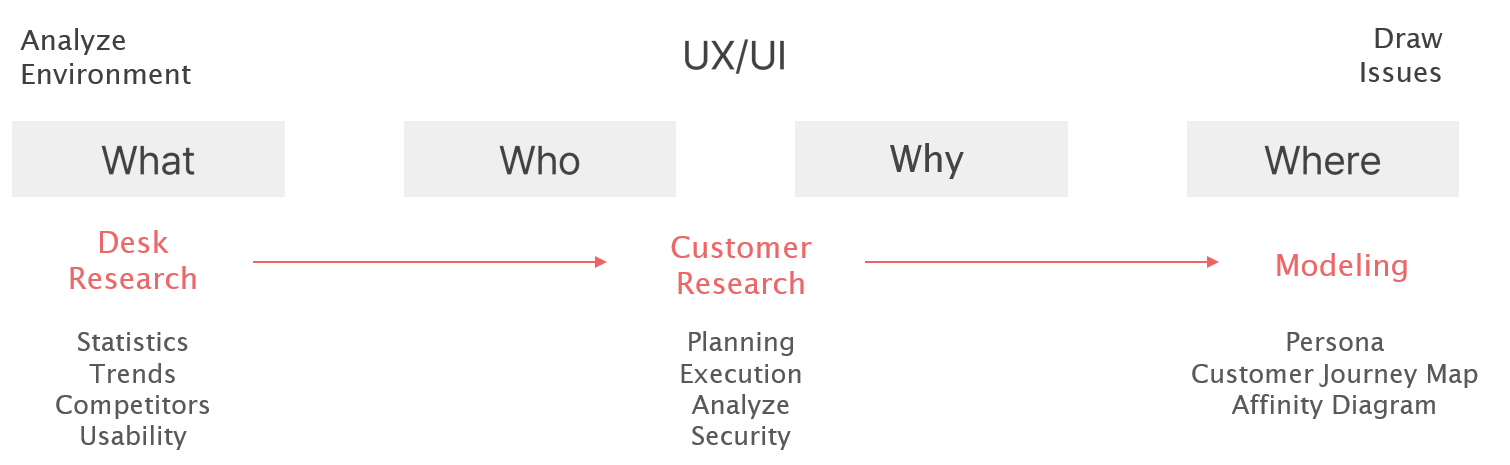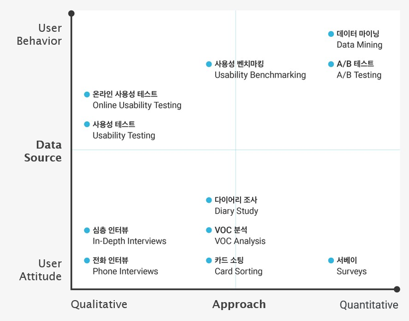 - Qualitative research: focus group interview (FGI), 1:1 in-depth interview (IDI), in-context interview(Ethonography), diary study, usability testing, think aloud